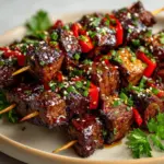 Delicious Asian Garlic Steak Skewers feature tender sirloin cubes marinated in a savory blend of soy sauce, brown sugar, sesame oil, garlic, and ginger. Grilled to perfection and topped with green onions and sesame seeds, these skewers are perfect for a flavorful and easy-to-make main course that pairs beautifully with steamed rice or grilled vegetables.