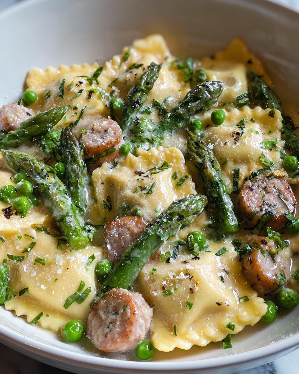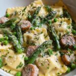 This delightful Asparagus Ravioli with Sausage and Peas recipe combines fresh pasta filled with tender asparagus, savory Italian sausage, and sweet peas in a buttery garlic sauce. It’s a quick and satisfying meal perfect for weeknights, featuring a harmonious balance of flavors and textures, topped with Parmesan cheese and fresh parsley for a flavorful finish.