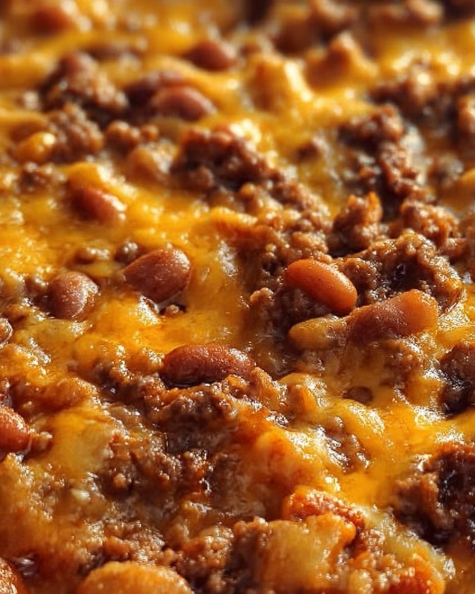 - Assemble the Casserole: Transfer the beef and bean mixture into a greased 9×13-inch casserole dish. Spread it evenly, then sprinkle the shredded cheddar cheese over the top.