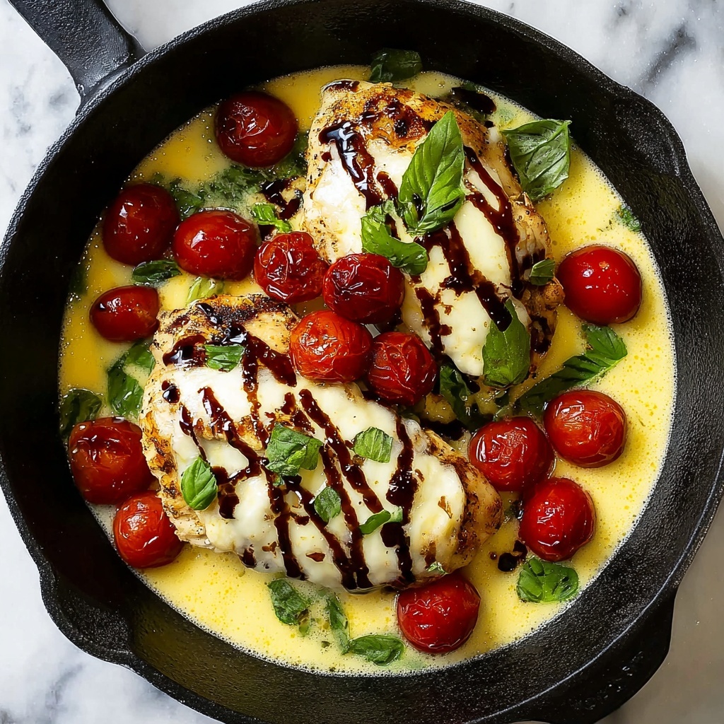 After searing, scatter the cherry tomatoes and small mozzarella balls around the chicken in the skillet. These will roast alongside the chicken, softening and melting into a luscious complement.
