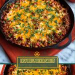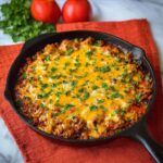 A comforting Beef and Tomato Skillet with creamy cheddar polenta, featuring a flavorful ground chuck and vegetable tomato sauce baked to perfection in a cast iron skillet. This hearty dish combines tender polenta with a savory meat and tomato topping, finished with melted cheddar cheese and fresh parsley garnish.