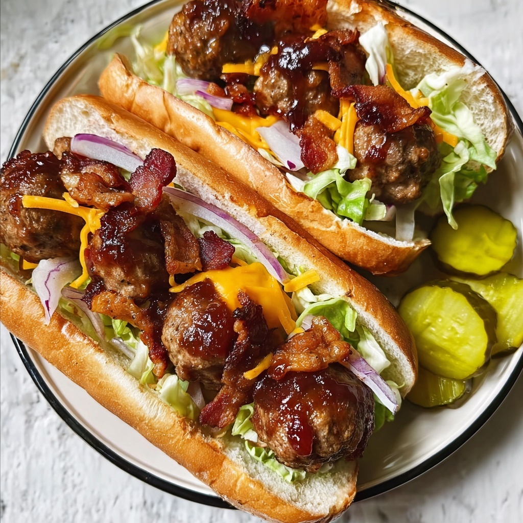 These Bourbon BBQ Bacon Cheeseburger Meatball Subs combine juicy, flavorful meatballs infused with bourbon and smothered in smoky BBQ sauce, layered with crispy bacon and melted cheddar cheese inside soft sub rolls. Perfect for a hearty, crowd-pleasing sandwich with all the fun flavors of a cheeseburger in a convenient meatball sub format.