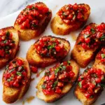 This Bruschetta recipe is a fresh, flavorful Italian appetizer featuring toasted baguette slices topped with a vibrant mixture of diced tomatoes, red onion, garlic, basil, and balsamic vinegar. Easy to prepare and guaranteed to impress, it’s perfect for gatherings or a light snack.