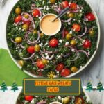 Arrange the dressed kale around the bowl of dressing to resemble a festive wreath. Then, artfully add the cherry tomatoes, green olives, sliced red onions, and crumbled feta cheese all around the kale in a circular pattern. This colorful arrangement not only looks stunning but harmonizes the salad’s textures and flavors.
