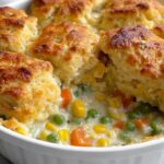 This hearty Cornbread Casserole recipe combines tender chicken, mixed vegetables, and a creamy sauce, all topped with a golden-baked cornbread crust. Perfect for a comforting family dinner, this dish blends savory flavors with a delightful texture contrast between the creamy filling and fluffy cornbread topping.