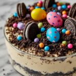 This Easter Dirt Cake is a fun and festive no-bake dessert perfect for spring celebrations. Featuring a creamy pudding and cream cheese filling layered with crushed Oreos, it mimics dirt and is topped with colorful Easter candies like Peeps and Robin eggs for a playful, seasonal touch.