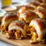 For a party or casual family dinner, arrange the Easy Cheesy Chicken-Filled Crescents Recipe on a large wooden board with small bowls of assorted dips like ranch, spicy mayo, or hummus. You could also slice a couple open to show off the cheesy, chicken-packed interior — it’s an instant crowd-pleaser that sparks conversation and appetite!