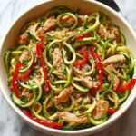 This Garlic Chicken Zucchini Noodles Stir Fry is a healthy and flavorful dish combining tender chicken breast with vibrant vegetables and zucchini noodles. Stir-fried in a savory sauce with garlic, ginger, and a hint of honey, it’s a quick and nutritious meal perfect for busy weeknights.