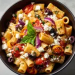 A refreshing and colorful Greek pasta salad featuring al dente rotini or penne pasta tossed with cherry tomatoes, cucumber, red onion, Kalamata olives, and feta cheese, all coated in a tangy oregano and lemon vinaigrette. Perfect as a light lunch or a summer side dish.