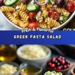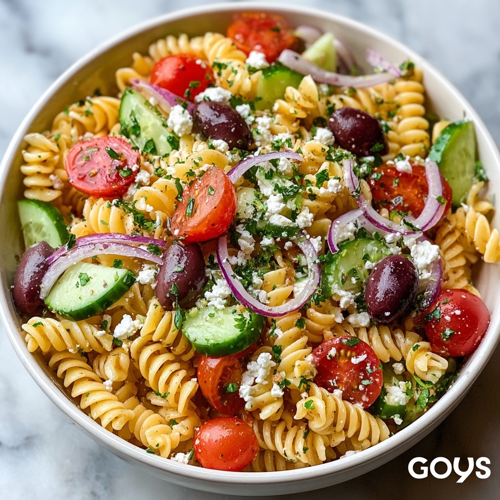 A vibrant and refreshing Greek Pasta Salad combining al dente rotini or penne pasta with crisp vegetables, tangy Kalamata olives, and creamy feta cheese, all tossed in a zesty homemade dressing of olive oil, red apple vinegar, Dijon mustard, and herbs. Perfect for a quick, flavorful side dish or light meal.