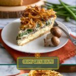 This Green Bean Pie features tender green beans, sautéed mushrooms, and onions in a creamy, flavorful filling enriched with cream cheese and seasoned with thyme, garlic, and Worcestershire sauce. The unique Ritz Cracker crust, made from crushed Ritz crackers mixed with melted butter and French fried onions, offers a crunchy, savory base that complements the creamy filling. Topped with crispy French fried onions, this pie is a comforting and innovative side dish perfect for gatherings and holiday meals.