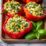 These Grilled Stuffed Bell Peppers are a vibrant and healthy meal option, filled with a flavorful mix of shredded zucchini, corn, fresh herbs, cooked brown rice, and garlic. Perfectly grilled to achieve tender, blistered peppers with a hearty vegetable filling, this recipe is ideal for outdoor cooking enthusiasts seeking a nutritious and vegetarian-friendly dish.