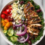 This Grilled Zesty Mediterranean Chicken Salad features tender, marinated chicken breasts grilled to perfection and served over a vibrant mix of fresh vegetables, kalamata olives, and crumbled feta cheese. Tossed with a tangy homemade red wine vinegar dressing, this salad is a refreshing, flavorful, and healthy meal perfect for lunch or dinner.