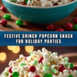 Grinch Popcorn is a festive and fun holiday snack featuring crunchy popcorn coated in vibrant green white chocolate and topped with red candy accents for a playful Christmas treat inspired by the Grinch.