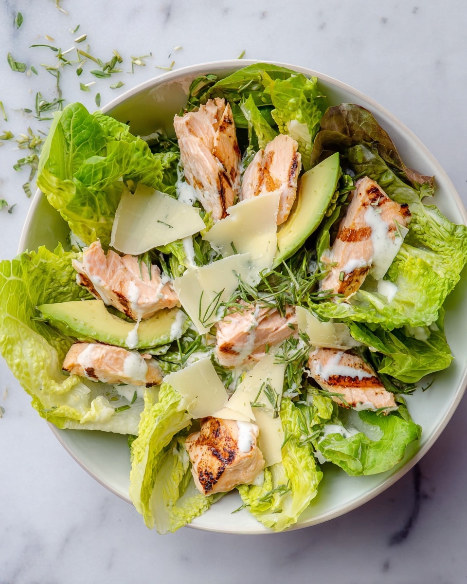 In a large bowl, toss the torn romaine lettuce with a generous amount of your prepared Caesar dressing and a good handful of shaved Parmesan cheese. Using a fork, break the grilled salmon into bite-sized chunks, then gently nestle them on top of the dressed greens. Don’t forget the creamy avocado slices—they bring a lush richness that balances the salad perfectly. Serve immediately for the freshest, most vibrant experience.