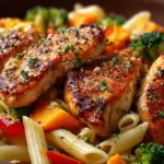 This Honey Garlic Chicken with Roasted Veggie Penne is a flavorful and wholesome weeknight dinner that combines tender chicken pieces coated in a sticky honey garlic sauce with roasted seasonal vegetables and perfectly cooked penne pasta. The dish balances savory, sweet, and slightly spicy notes, making it a comforting yet healthy meal option suitable for the whole family.