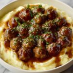 This classic Salisbury meatballs and mashed potatoes recipe features juicy, flavorful beef meatballs simmered in a rich onion and Worcestershire gravy, served alongside creamy, buttery mashed potatoes. Perfect for a comforting family dinner, these meatballs balance savory spices and a smooth, velvety sauce paired with fluffy potatoes for the ultimate hearty meal.