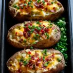 This Loaded Baked Potatoes recipe features perfectly baked russet potatoes topped with melting butter, sharp cheddar cheese, sour cream, and fresh chives. Customize with an array of delicious add-ons like steamed broccoli, grilled chicken or steak, sautéed mushrooms, black beans, chili, or crumbled sausage for a hearty and versatile meal.