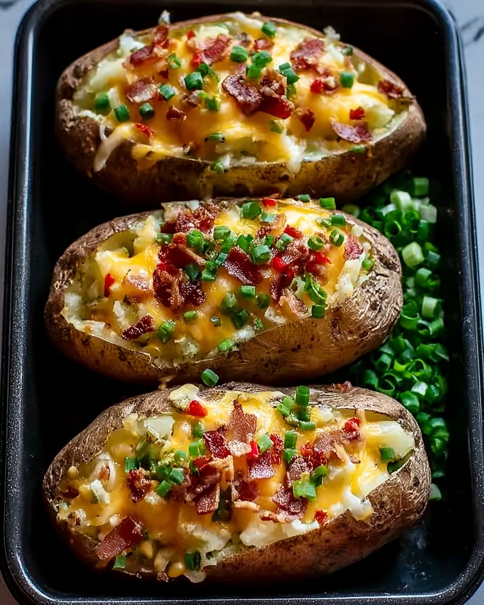 Want to impress your guests? Serve these loaded baked potatoes halved and scooped slightly in a rustic wooden bowl with toppings in separate small dishes for a fun DIY bar. Or cut the potatoes into wedges after baking, then load each piece with toppings for bite-sized finger foods perfect for parties. Another idea is to slice the potatoes horizontally creating “potato boats” that sit perfectly on platters, making for an eye-catching and shareable presentation.