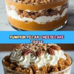 This Maple Pecan & Pumpkin Cheesecake Trifle is a delightful layered dessert combining moist pumpkin spice cake, creamy maple-flavored cheesecake, whipped cream, and crunchy pecans. Perfect for fall gatherings, it blends warm autumn flavors with a creamy texture, elegantly served in a trifle dish for an impressive presentation.