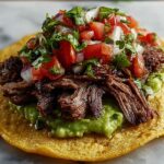 This recipe for Mexican Tostadas de Beef Carne Asada features tender and flavorful grilled flank or skirt steak marinated in a zesty blend of lime juice, garlic, and spices. Served on crispy corn tostada shells and topped with creamy guacamole, sour cream, fresh diced tomatoes, cilantro, and optional jalapeños, these tostadas make a vibrant, satisfying meal perfect for gatherings or a delicious weeknight dinner.