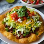 The perfect Navajo Tacos on Fry Bread Bliss Recipe is not complete without colorful, fresh garnishes. Crisp shredded lettuce adds refreshing crunch, while diced tomatoes bring a burst of juicy sweetness. A sprinkle of shredded cheese melts slightly from the heat and offers creamy contrast. Finally, dollops of sour cream and spoonfuls of salsa elevate the flavor complexity and visual appeal.