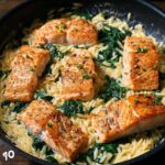 - Combine salmon and serve: Return the seared salmon fillets to the skillet on top of the orzo. Cook together for an additional 2-3 minutes to reheat the salmon and meld flavors. Garnish with freshly ground black pepper, chili flakes, and chopped fresh parsley before serving.