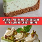 Slice the cheesecake into generous wedges and serve them on elegant dessert plates, garnished with edible flowers or thinly sliced almonds for an elegant look. For a party, serve mini versions in small glasses layered with crushed almond crust and whipped cream for a playful, deconstructed take on the Pistachio Cheesecake with Almond Crust Recipe.