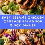 A vibrant and crunchy Sesame Chicken Cabbage Crunch Salad featuring shredded cabbage, tender grilled chicken, fresh vegetables, and a flavorful sesame dressing. Perfect for a healthy and quick dinner packed with texture and Asian-inspired flavors.