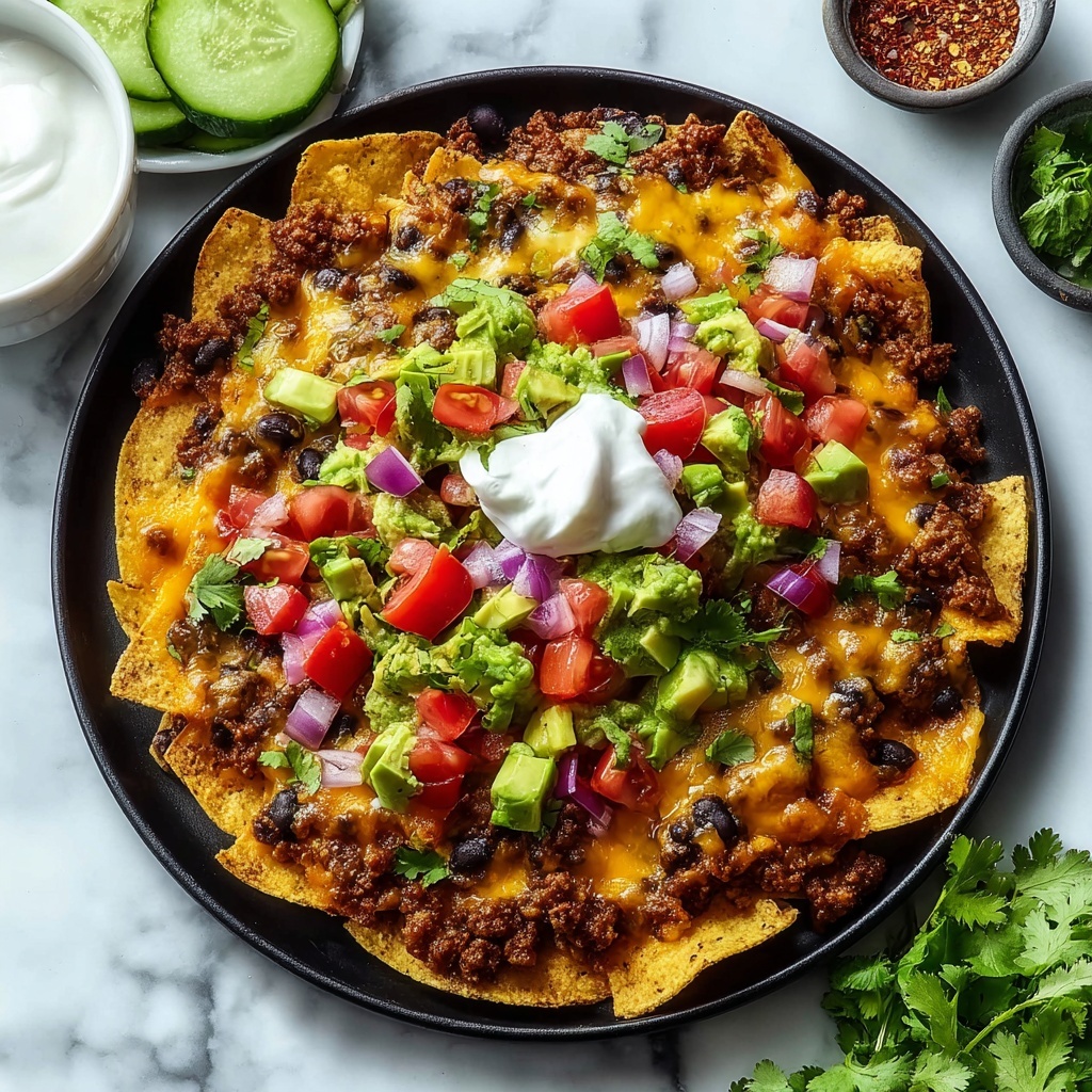 - Add Sour Cream and Cilantro: Drizzle 1/4 cup sour cream over the toppings, then garnish with 1/4 cup chopped cilantro for freshness.