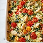 Once out of the oven, let the Simple Chicken Orzo Bake rest for 5 to 10 minutes. This pause allows the flavors to settle and the dish to firm up slightly, making it easier to serve and all the more delicious.