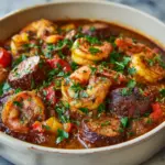 This Slow Cooker Jambalaya recipe is a flavorful and hearty Cajun dish combining tender chicken, spicy andouille sausage, succulent shrimp, and a medley of fresh vegetables. Cooked slowly to meld the vibrant spices and perfect rice texture, it offers an easy, hands-off way to enjoy a classic Southern meal.