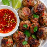 These Spicy Baked Shrimp Balls are a flavorful and healthy appetizer featuring finely chopped shrimp combined with aromatic garlic, shallots, Thai chili peppers, and fresh herbs. Lightly baked to perfection and served with sweet chili sauce, they make a delightful snack or party treat.