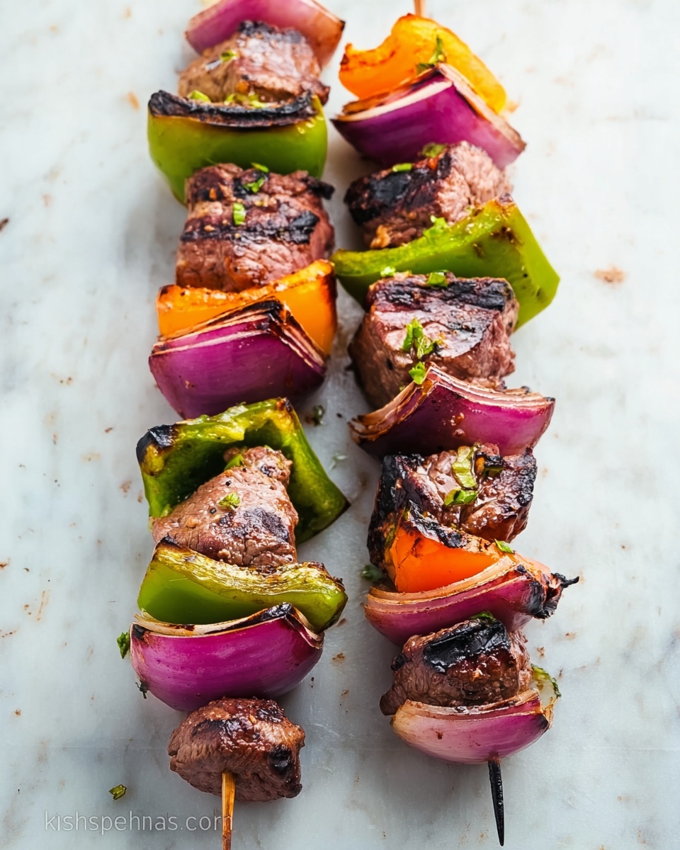 For a party or family gathering, serve the kabobs stacked on a rustic wooden board with colorful bowls of sides and sauces around. You can even turn this into a DIY skewer bar where guests build their own kabobs from grilled vegetables and beef. It’s fun, interactive, and looks incredibly inviting.