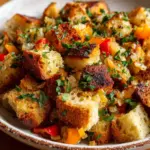 This classic Thanksgiving stuffing recipe features toasted bread cubes combined with sautéed onions, celery, garlic, and fragrant herbs, all moistened with broth and baked to golden perfection. Perfect as a savory side dish for your holiday feast, it delivers comforting flavors and a crispy top texture.