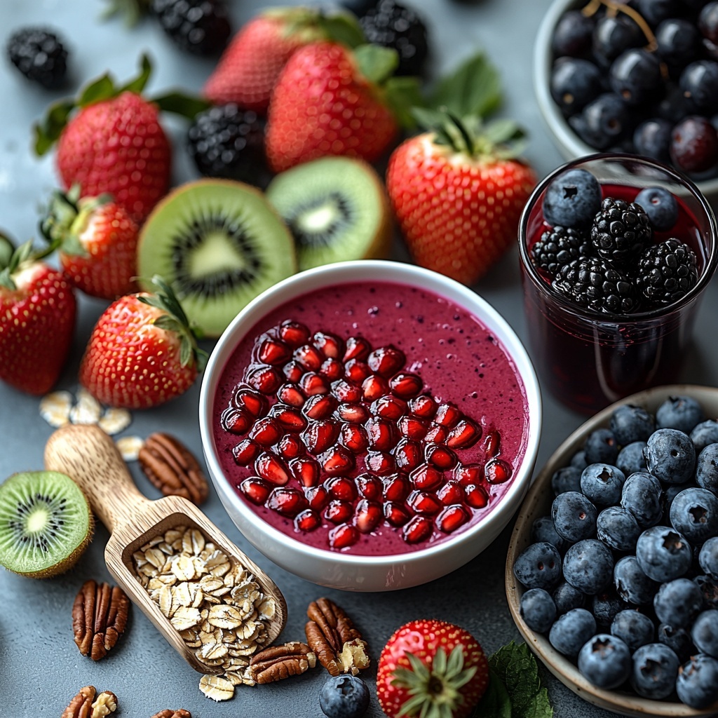 This Very Berry Kiwi Smoothie Bowl is a delicious and vibrant blend of fresh berries and pomegranate juice, combined with creamy vanilla yogurt. Perfect for a quick, nutritious breakfast or snack, it’s topped with fresh fruit slices, oats, and crunchy pecans for added texture and flavor.