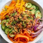This Viral Cucumber Pepper Salad is a vibrant, crunchy, and flavorful dish featuring Persian cucumbers, mini sweet bell peppers, carrots, and shallots tossed in a zesty Asian miso ginger dressing, enhanced with chili crunch oil and everything bagel seasoning. Perfect as a refreshing side or light lunch, this no-cook salad is quick to prepare and delivers a delightful balance of textures and flavors.