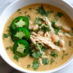 Serve your White Chicken Chili Recipe piping hot, topped with a generous handful of shredded Monterey Jack cheese, crisp jalapeño slices, bright lime wedges, and a sprinkle of chopped fresh cilantro. These toppings not only add visual appeal but also layers of flavor and texture that make each bite exciting.